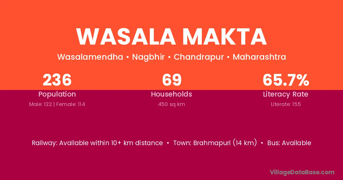 Brahmapuri (14 km) is the nearest town to Wasala Makta village for major economic activities and is located approximately 14 km away.