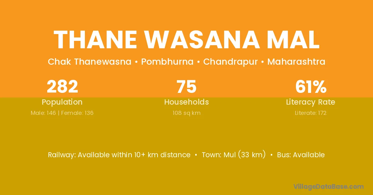 Mul (33 km) is the nearest town to Thane Wasana Mal village for major economic activities and is located approximately 33 km away.