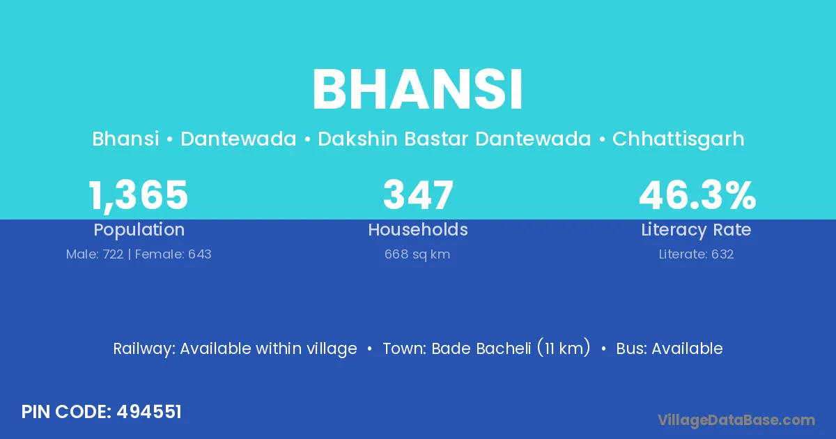 The literacy rate of Bhansi village is 57.24%. Male literacy stands at 63.30% and female literacy at 50.58%.