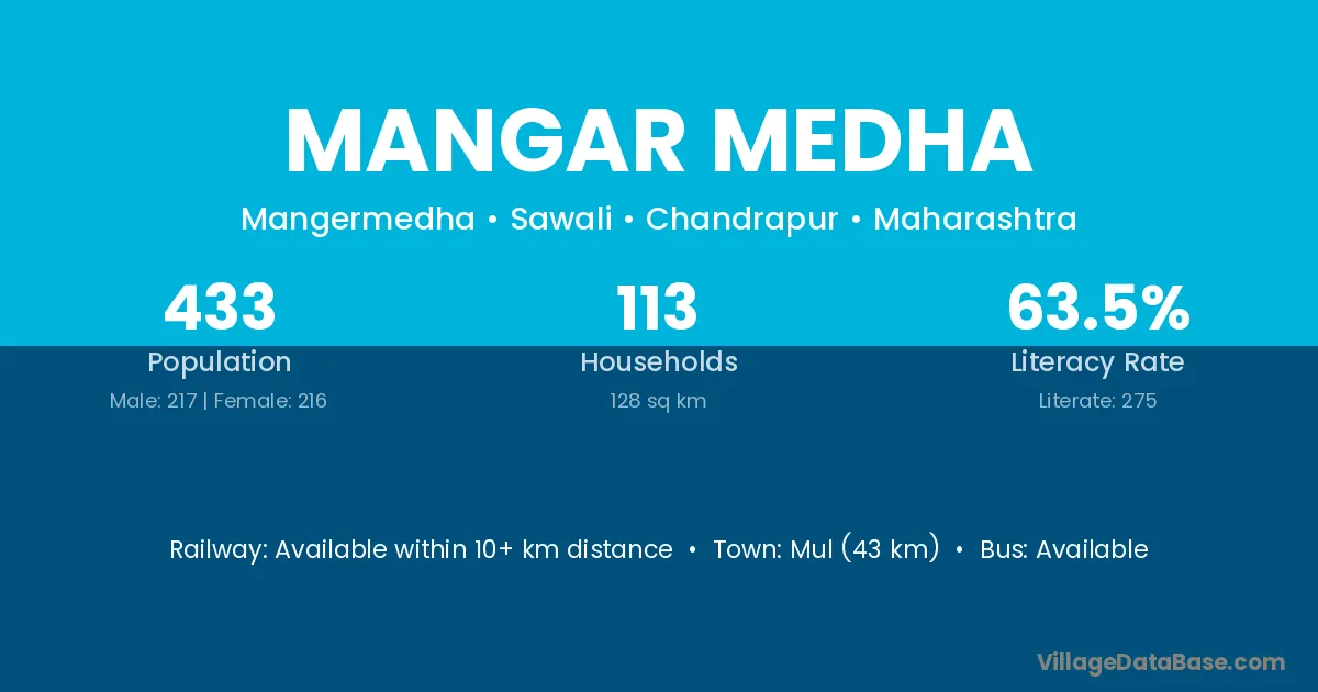 Mul (43 km) is the nearest town to Mangar Medha village for major economic activities and is located approximately 43 km away.