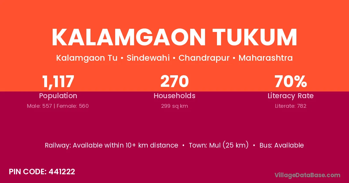 Mul (25 km) is the nearest town to Kalamgaon Tukum village for major economic activities and is located approximately 25 km away.