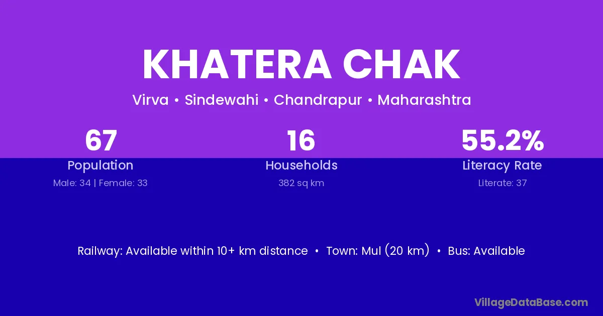 Khatera Chak village has a total population of 67 people, of which 34 are males and 33 are females.