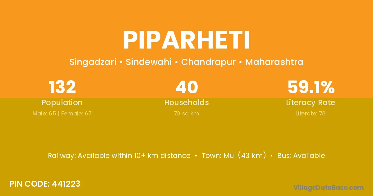 Mul (43 km) is the nearest town to Piparheti village for major economic activities and is located approximately 43 km away.
