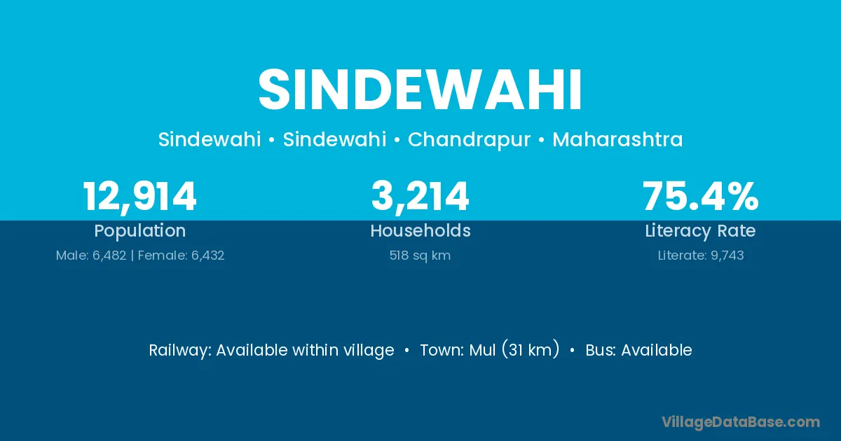 Sindewahi village has a total population of 12,914 people, of which 6,482 are males and 6,432 are females.
