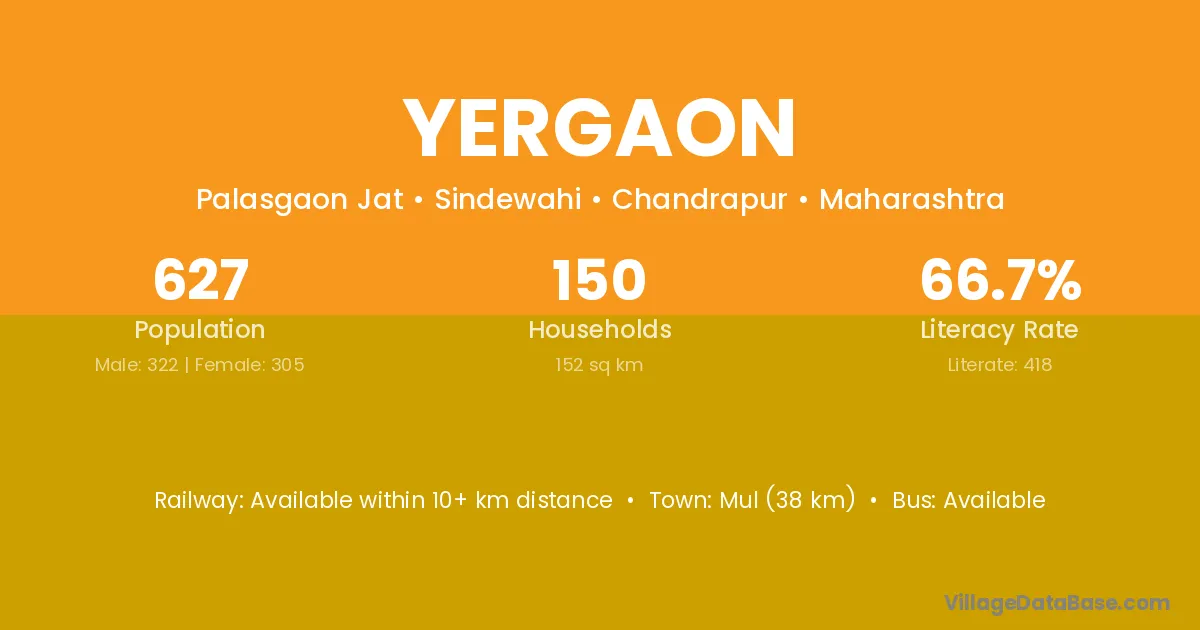 Mul (38 km) is the nearest town to Yergaon village for major economic activities and is located approximately 38 km away.