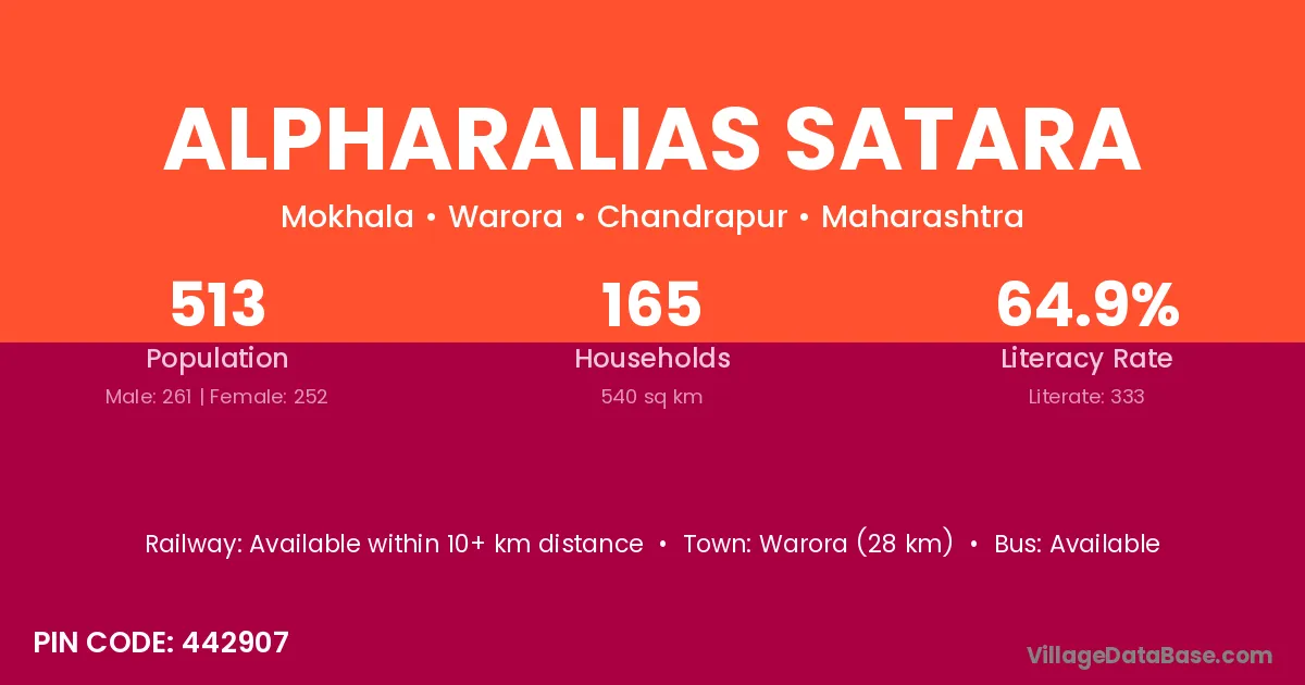 Warora (28 km) is the nearest town to Alpharalias Satara village for major economic activities and is located approximately 28 km away.