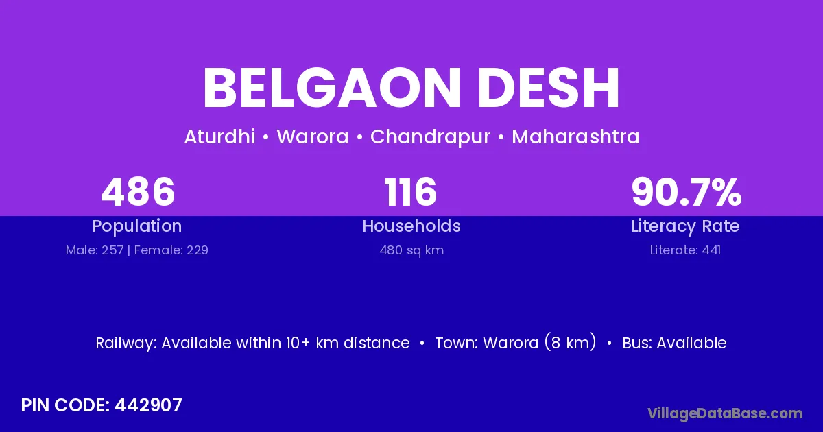 Warora (8 km) is the nearest town to Belgaon Desh village for major economic activities and is located approximately 8 km away.