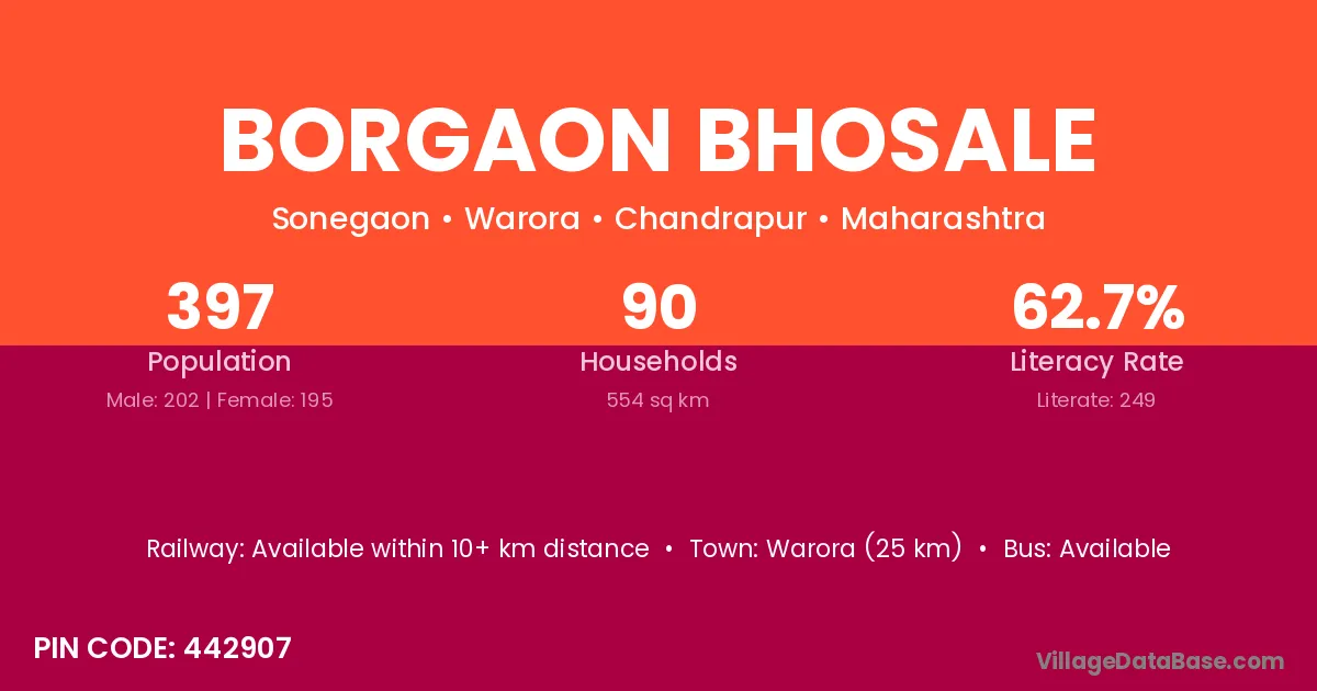 Warora (25 km) is the nearest town to Borgaon Bhosale village for major economic activities and is located approximately 25 km away.