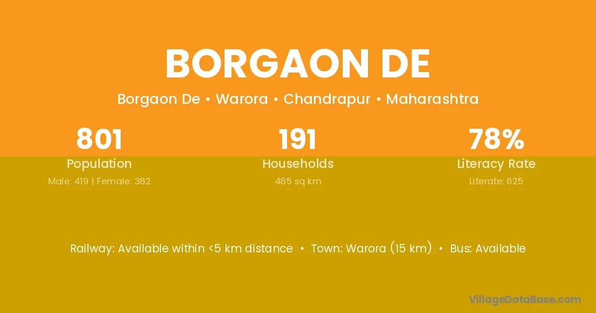 Warora (15 km) is the nearest town to Borgaon De village for major economic activities and is located approximately 15 km away.