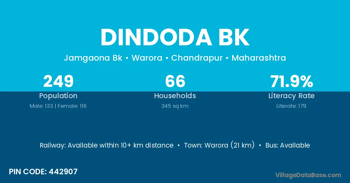 Warora (21 km) is the nearest town to Dindoda Bk village for major economic activities and is located approximately 21 km away.