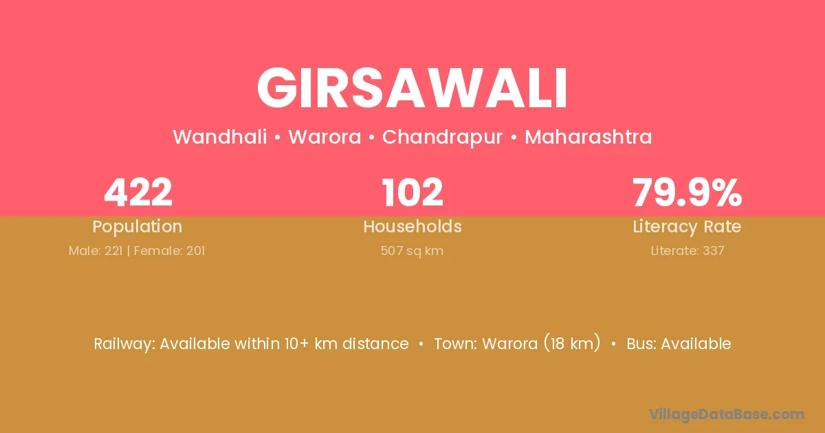 Warora (18 km) is the nearest town to Girsawali village for major economic activities and is located approximately 18 km away.