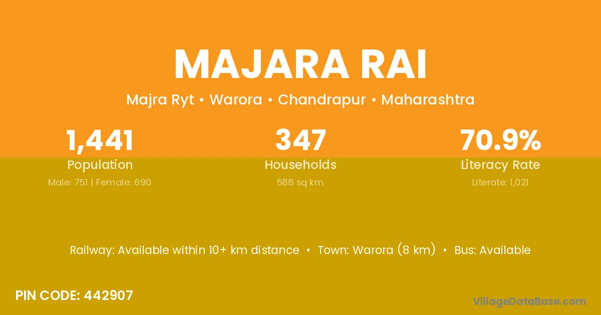 Warora (8 km) is the nearest town to Majara Rai village for major economic activities and is located approximately 8 km away.