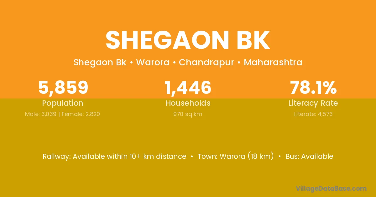 Warora (18 km) is the nearest town to Shegaon Bk village for major economic activities and is located approximately 18 km away.