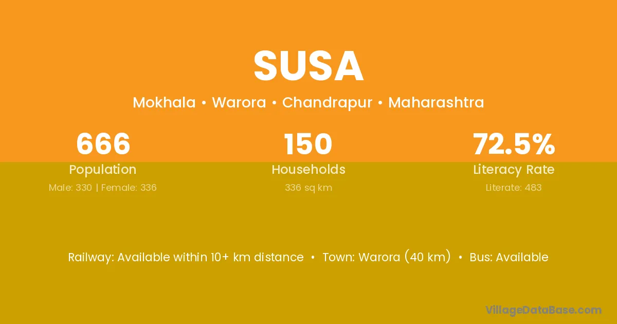 Warora (40 km) is the nearest town to Susa village for major economic activities and is located approximately 40 km away.