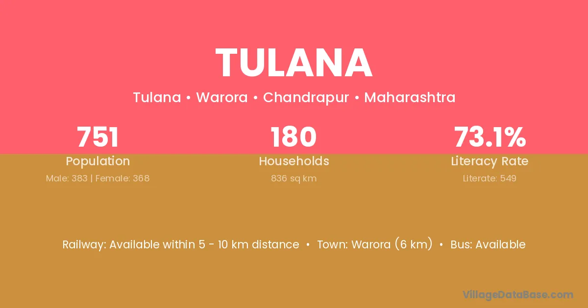 Warora (6 km) is the nearest town to Tulana village for major economic activities and is located approximately 6 km away.