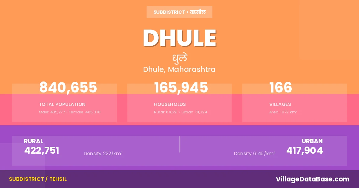 According to the 2011 census The total area of Dhule Tehsil is 1972 km², with a population of 840655 people. The population density is 426 inhabitants per square kilometre, and there are approximately 165945 houses in the sub district.