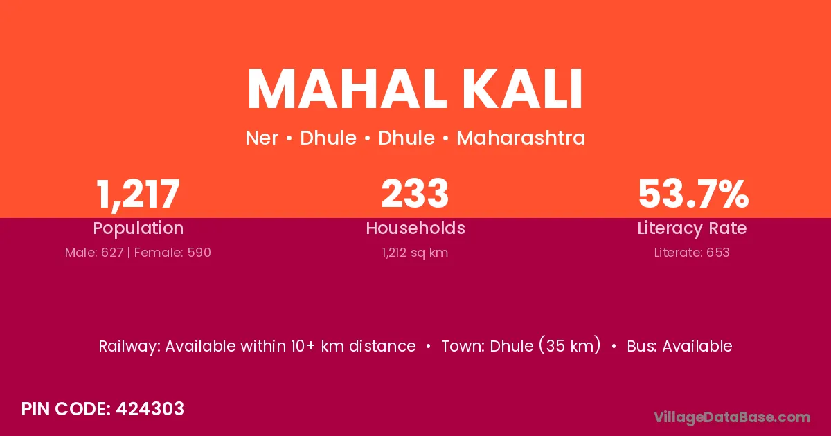 Dhule (35 km) is the nearest town to Mahal Kali village for major economic activities and is located approximately 35 km away.