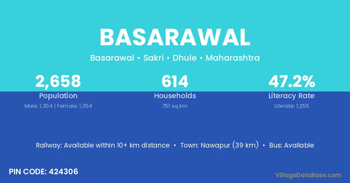Nawapur (39 km) is the nearest town to Basarawal village for major economic activities and is located approximately 39 km away.