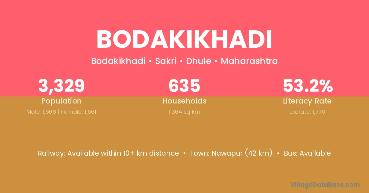 Nawapur (42 km) is the nearest town to Bodakikhadi village for major economic activities and is located approximately 42 km away.
