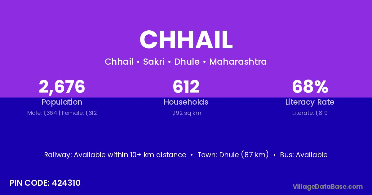 Dhule (87 km) is the nearest town to Chhail village for major economic activities and is located approximately 87 km away.