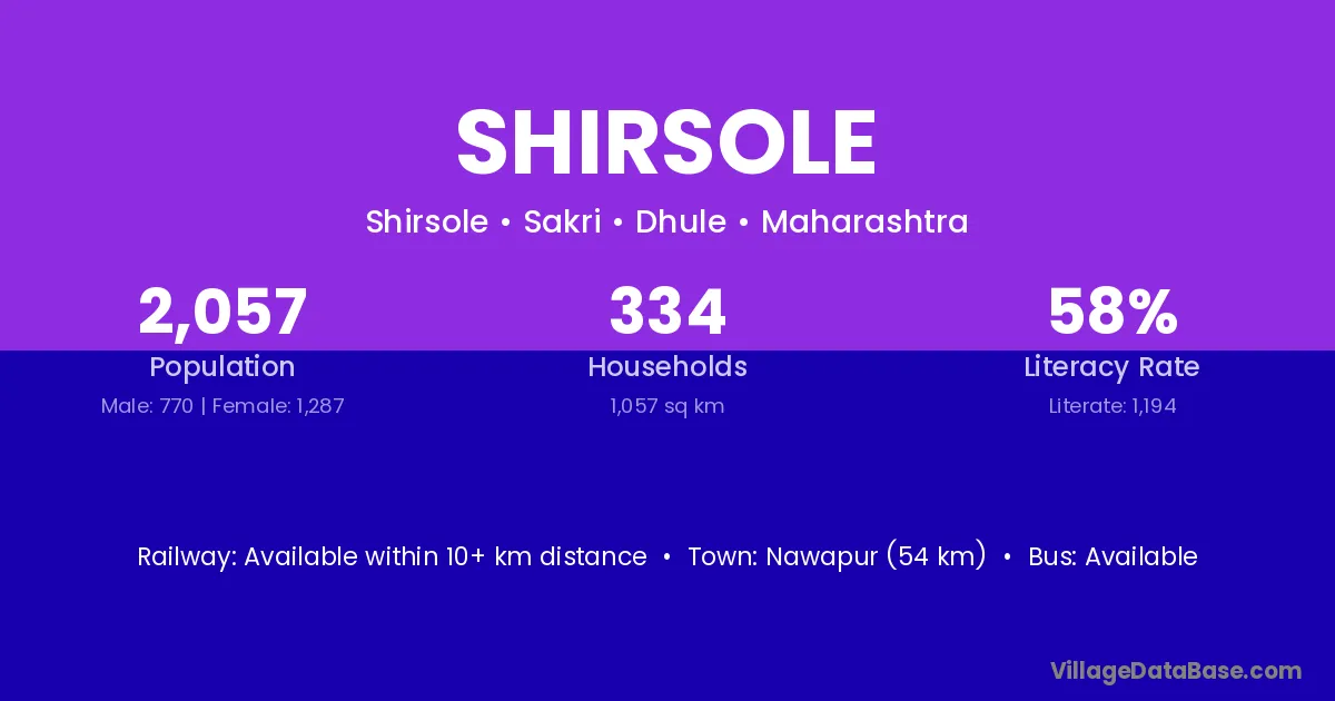 Nawapur (54 km) is the nearest town to Shirsole village for major economic activities and is located approximately 54 km away.