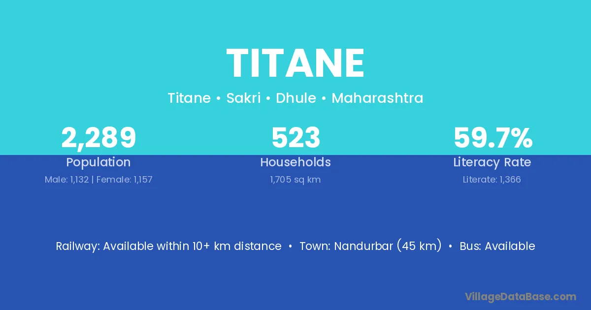 Nandurbar (45 km) is the nearest town to Titane village for major economic activities and is located approximately 45 km away.