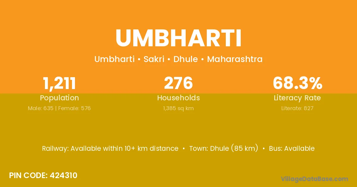 Dhule (85 km) is the nearest town to Umbharti village for major economic activities and is located approximately 85 km away.