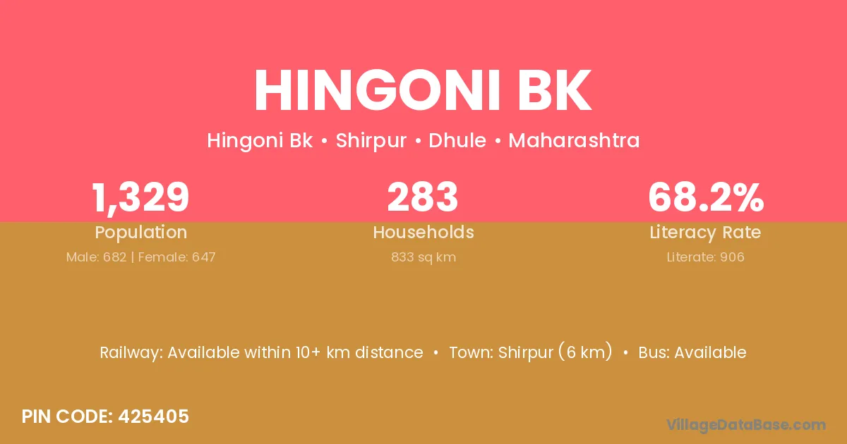 Hingoni Bk village has a total population of 1,329 people, of which 682 are males and 647 are females.