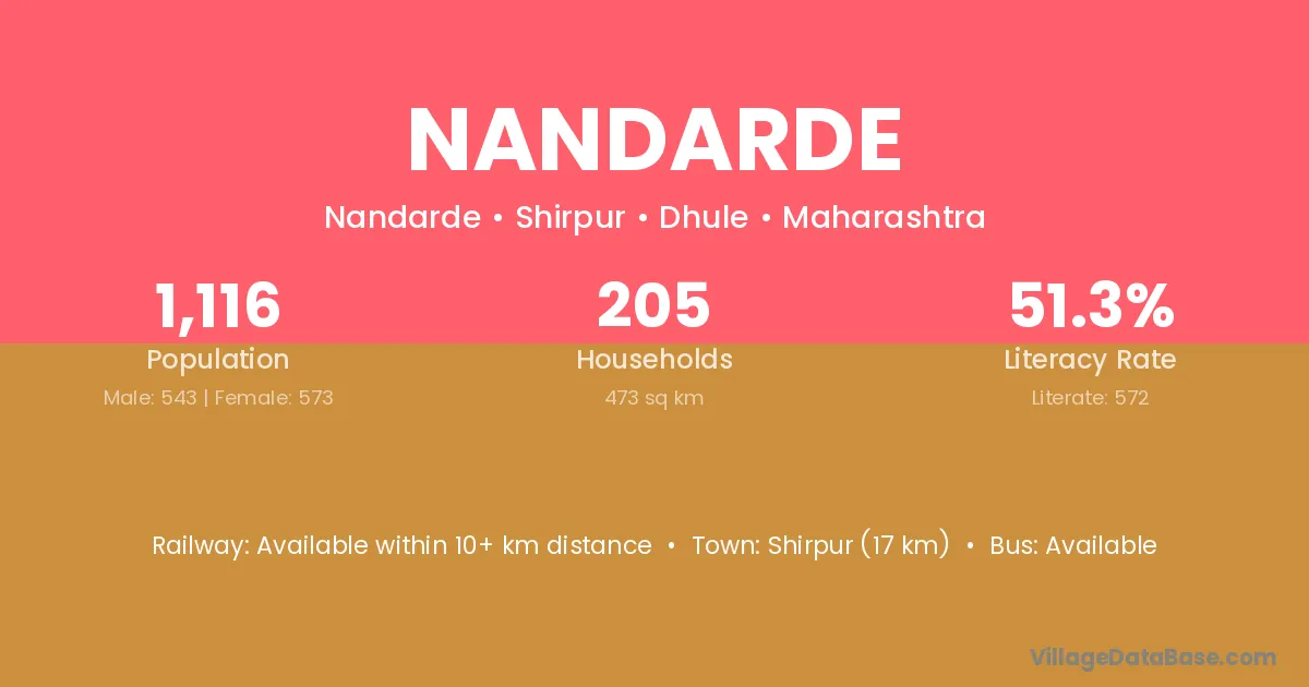 Shirpur (17 km) is the nearest town to Nandarde village for major economic activities and is located approximately 17 km away.