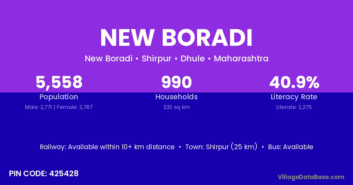 Shirpur (25 km) is the nearest town to New Boradi village for major economic activities and is located approximately 25 km away.