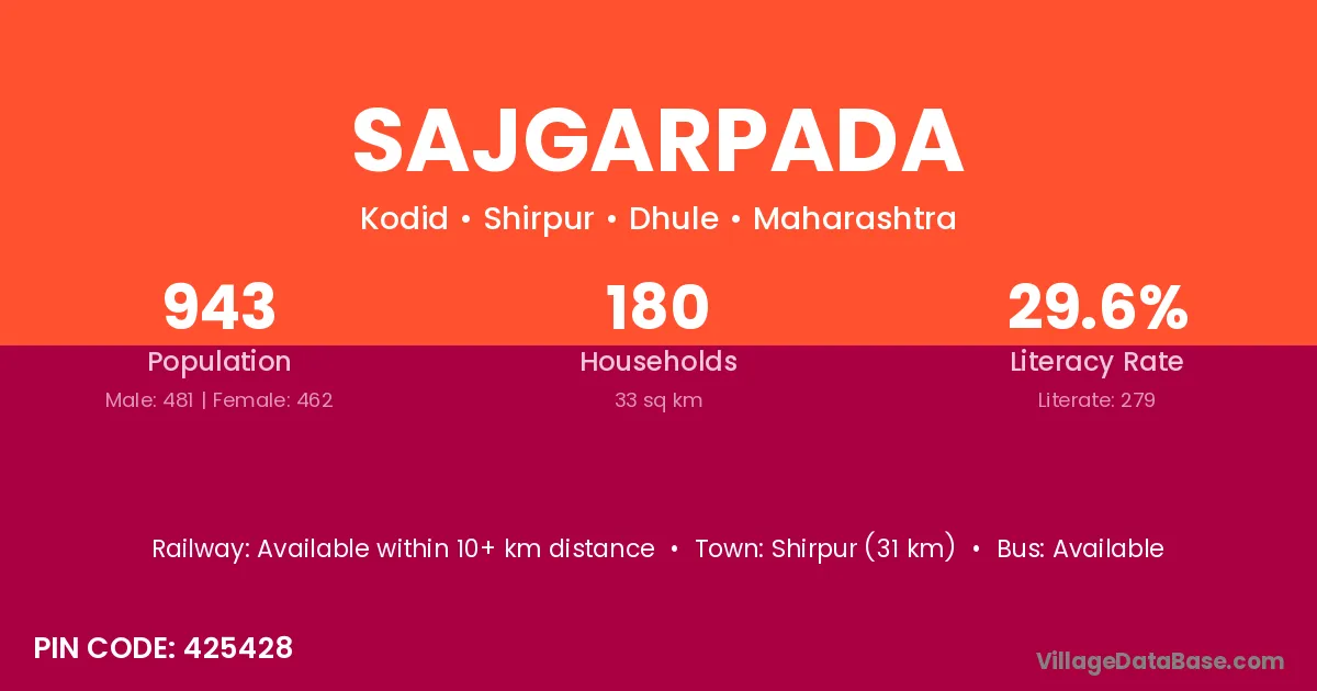 Sajgarpada village has a total population of 943 people, of which 481 are males and 462 are females.