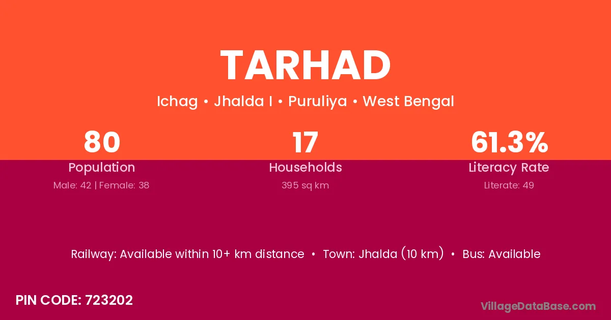The literacy rate of Tarhad village is 53.70%. Male literacy stands at 59.91% and female literacy at 47.37%.