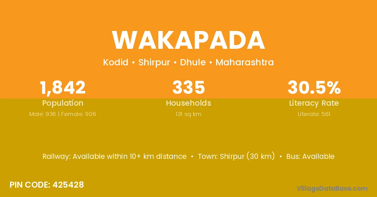 Shirpur (30 km) is the nearest town to Wakapada village for major economic activities and is located approximately 30 km away.