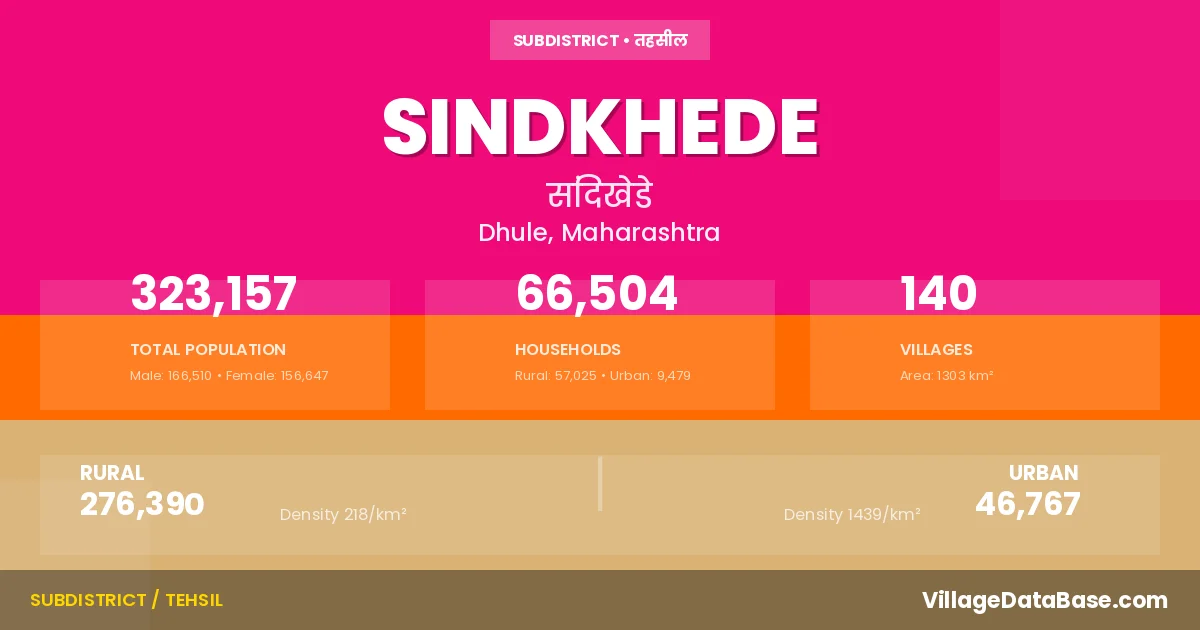 According to the 2011 census The total area of Sindkhede Tehsil is 1303 km², with a population of 323157 people. The population density is 248 inhabitants per square kilometre, and there are approximately 66504 houses in the sub district.