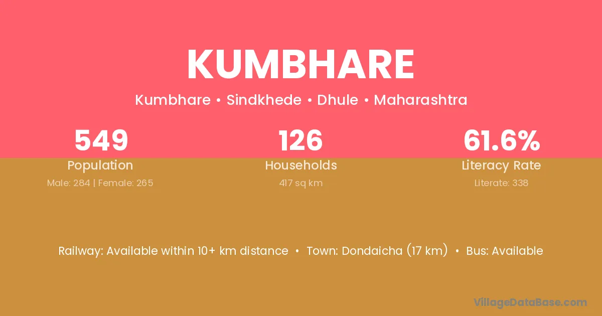 Dondaicha (17 km) is the nearest town to Kumbhare village for major economic activities and is located approximately 17 km away.