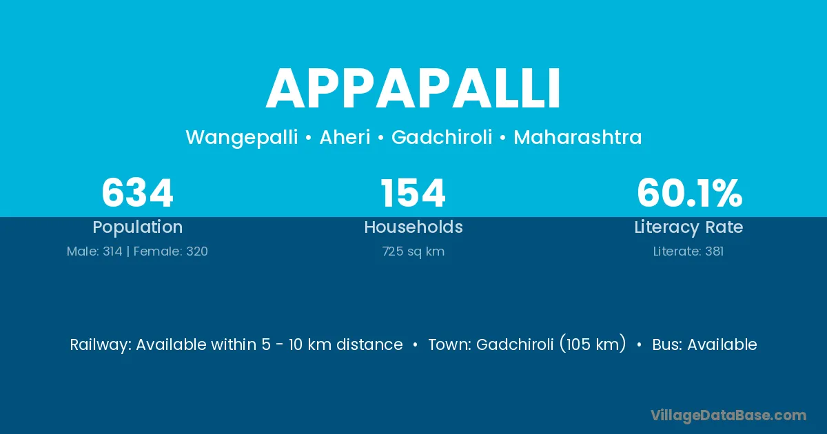 Gadchiroli (105 km) is the nearest town to Appapalli village for major economic activities and is located approximately 105 km away.