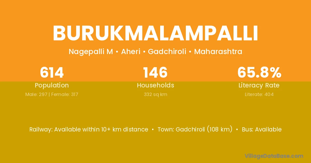 Gadchiroli (108 km) is the nearest town to Burukmalampalli village for major economic activities and is located approximately 108 km away.