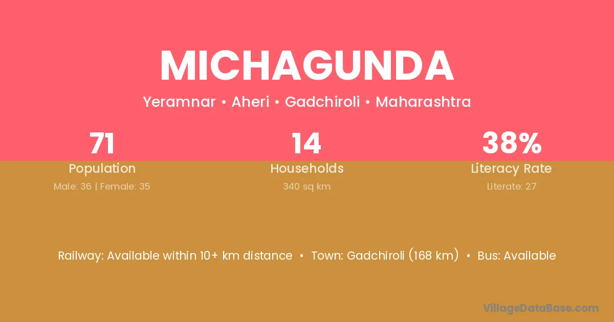 Gadchiroli (168 km) is the nearest town to Michagunda village for major economic activities and is located approximately 168 km away.
