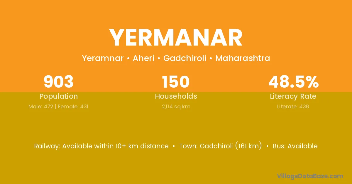 Gadchiroli (161 km) is the nearest town to Yermanar village for major economic activities and is located approximately 161 km away.