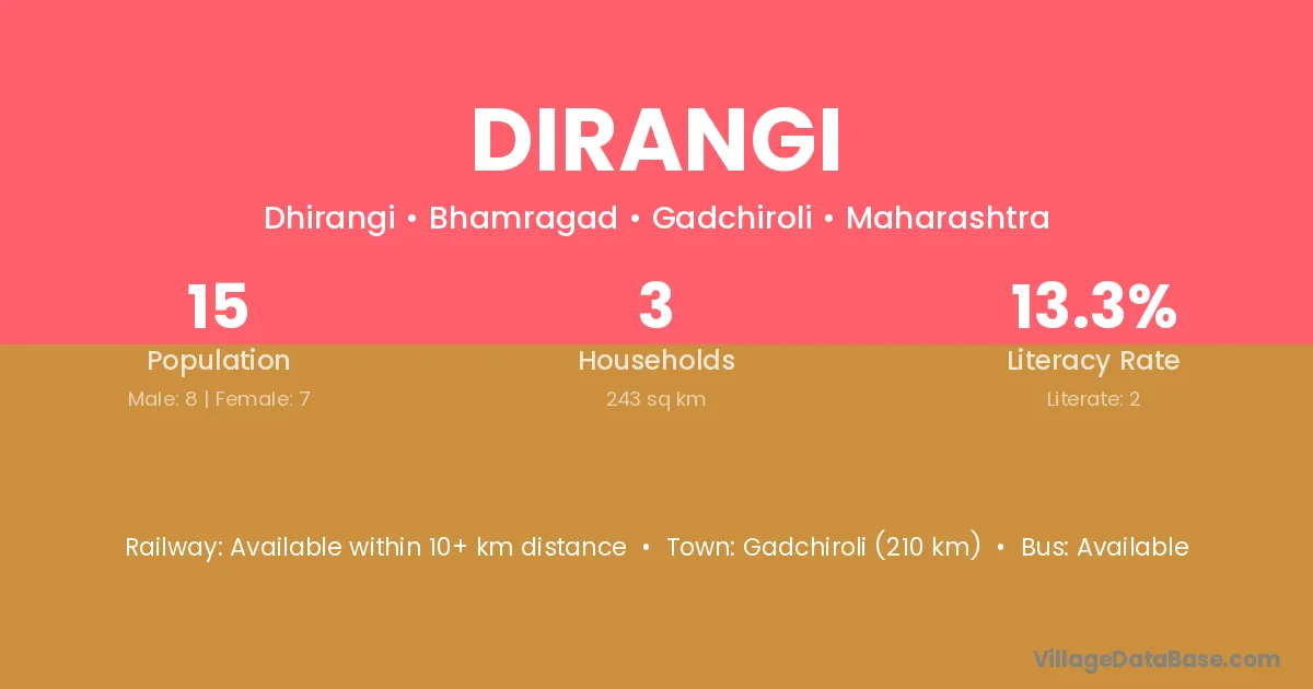 Gadchiroli (210 km) is the nearest town to Dirangi village for major economic activities and is located approximately 210 km away.