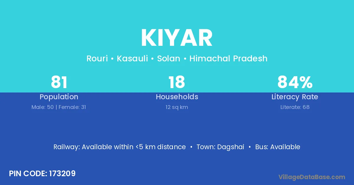 The literacy rate of Kiyar village is 40.59%. Male literacy stands at 52.55% and female literacy at 29.18%.