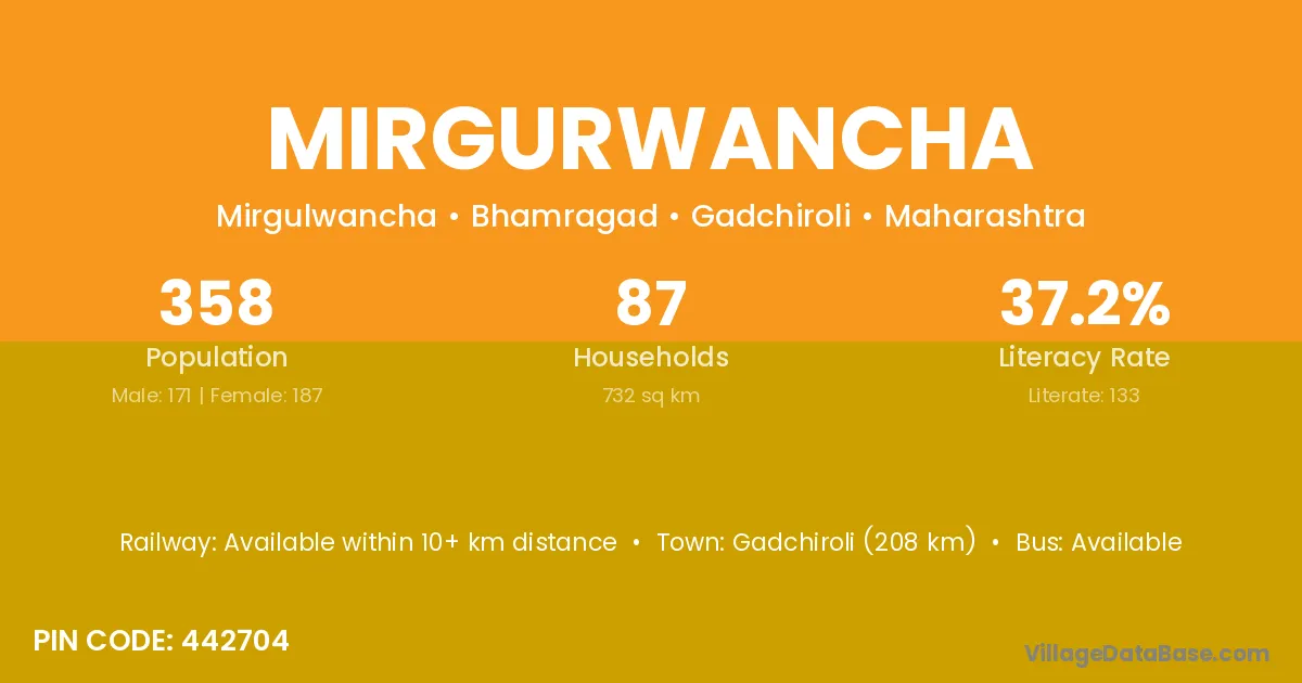 Gadchiroli (208 km) is the nearest town to Mirgurwancha village for major economic activities and is located approximately 208 km away.