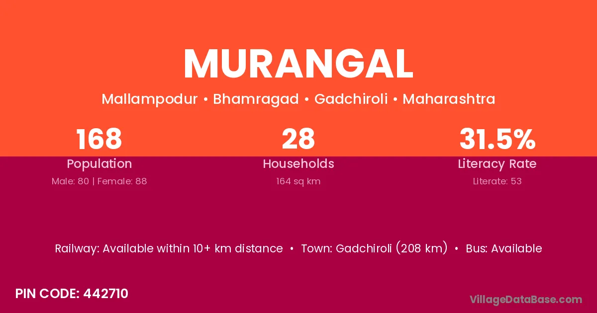 Gadchiroli (208 km) is the nearest town to Murangal village for major economic activities and is located approximately 208 km away.