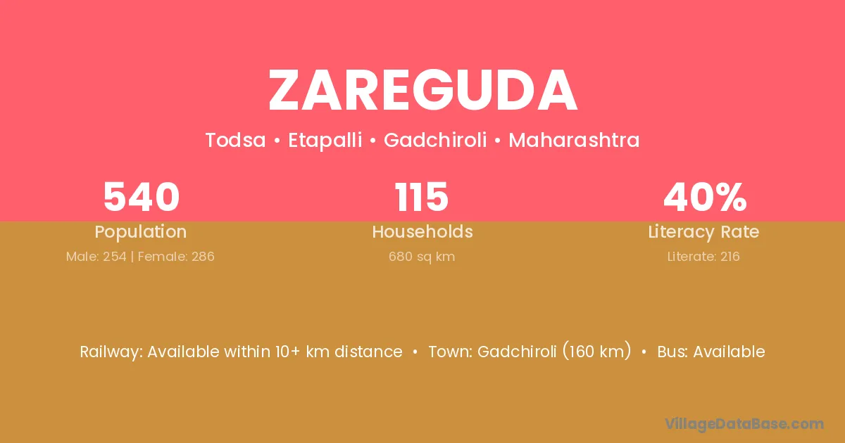 Gadchiroli (239 km) is the nearest town to Zareguda village for major economic activities and is located approximately 239 km away.