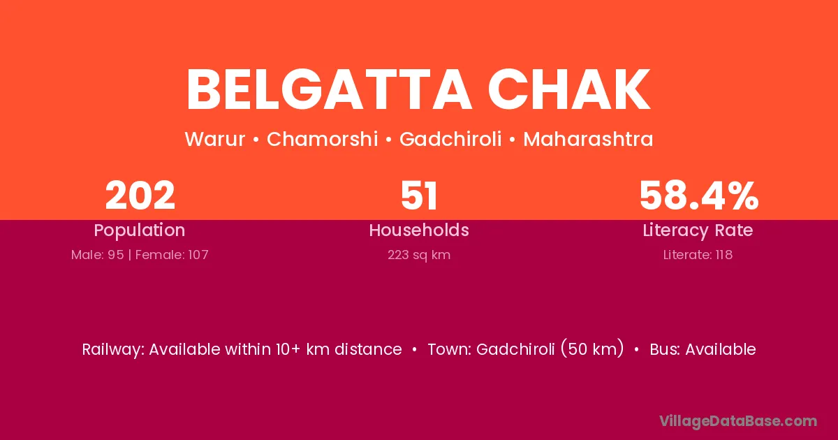 Gadchiroli (50 km) is the nearest town to Belgatta Chak village for major economic activities and is located approximately 50 km away.