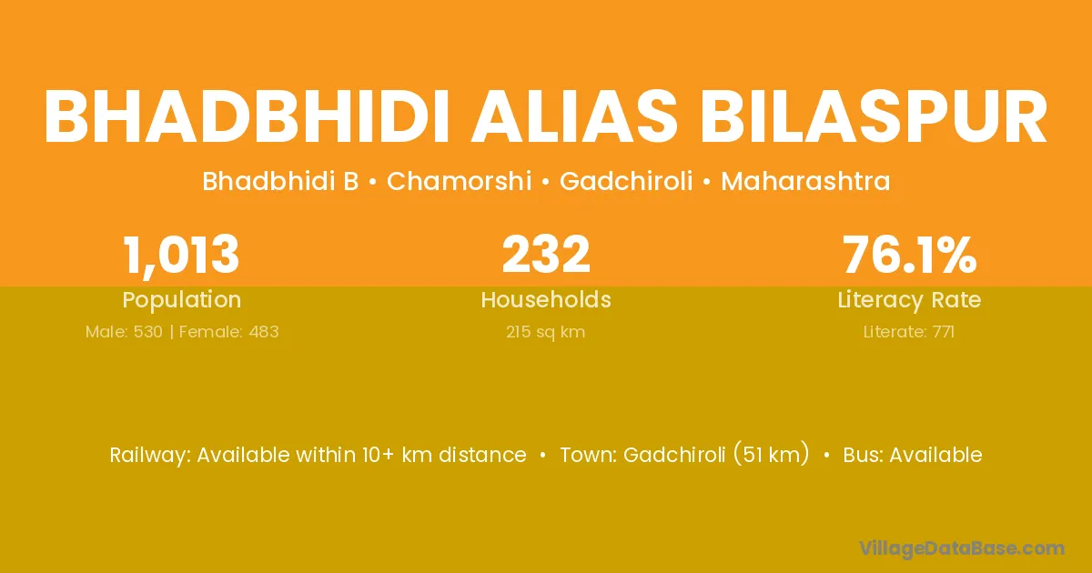 Bhadbhidi Alias Bilaspur village has a total population of 1,013 people, of which 530 are males and 483 are females.
