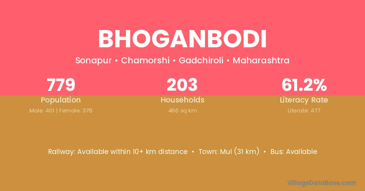 Mul (31 km) is the nearest town to Bhoganbodi village for major economic activities and is located approximately 31 km away.