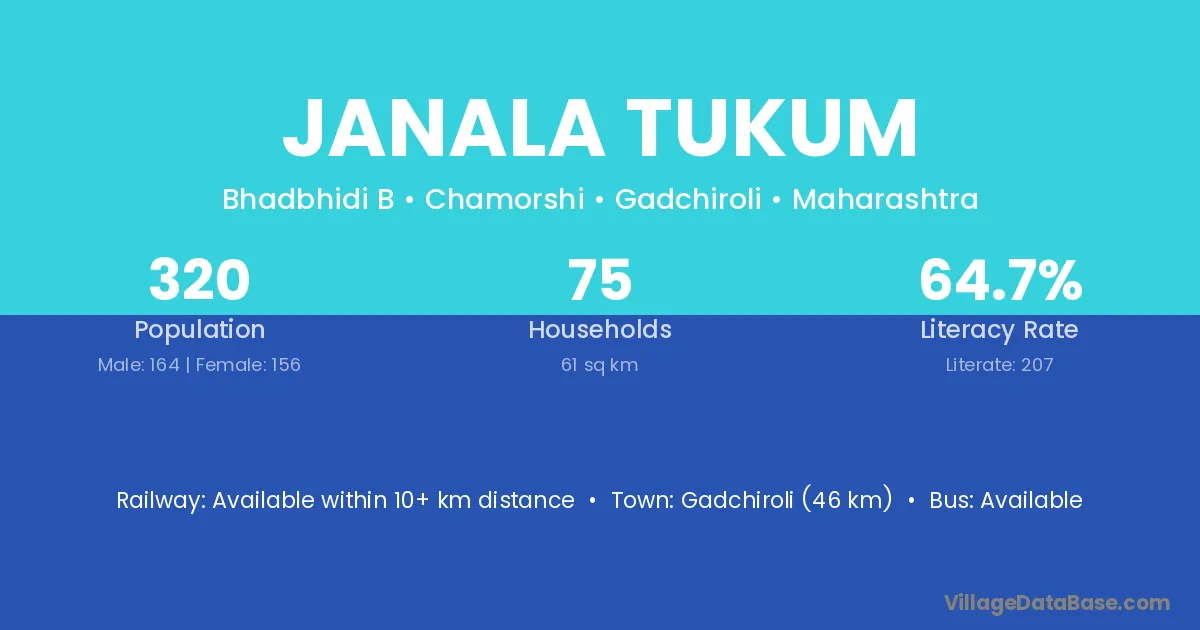 Gadchiroli (46 km) is the nearest town to Janala Tukum village for major economic activities and is located approximately 46 km away.