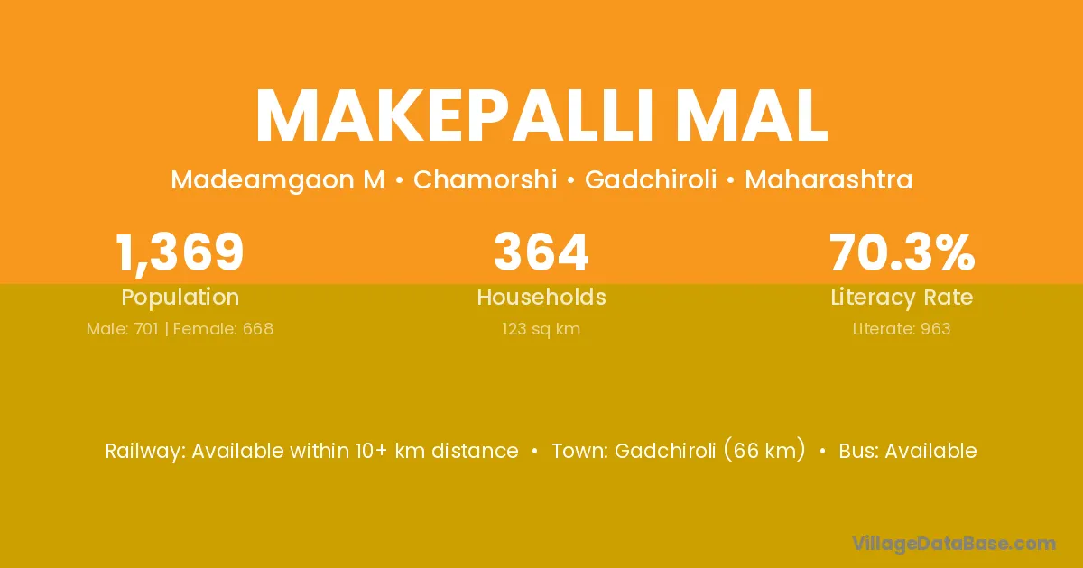 Gadchiroli (66 km) is the nearest town to Makepalli Mal village for major economic activities and is located approximately 66 km away.