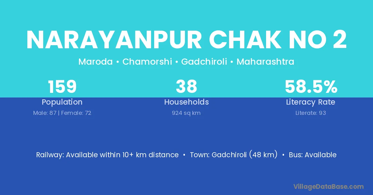 Gadchiroli (48 km) is the nearest town to Narayanpur Chak No 2 village for major economic activities and is located approximately 48 km away.